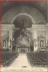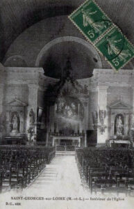 Deux vitraux de part et d’autre du chœur doivent retenir l’attention : ils datent du début du XIXème siècle et sont signés du saint-georgeois Charles Thierry. Peintre, ferblantier, décorateur remarqué par la comtesse de Serrant et travaillant d’abord dans l’atelier qu’elle avait fait édifier dans le château de Serrant, il devint un peintre sur verre apprécié et fournit en vitraux de nombreuses églises de la région. C’est sans doute en 1828 qu’il réalisa ceux de l’église de Saint Georges. La mode alors était au verre peint. Thierry avait réintroduit l’art du vitrail en Europe et l’atelier qu’il fonda à Angers en 1844 existe toujours.
