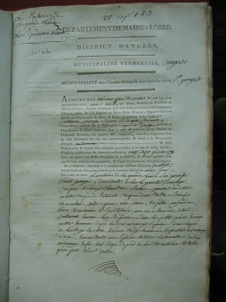 Acte de vente de la Grande Lande en 1791 (ADML)